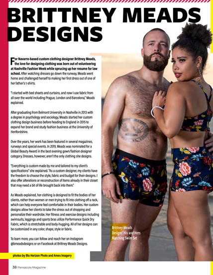 Her fitness and exercise designs including swimsuits, leggings and sports bras utilize Performance Quick Dry Fabric, which is stretchable and body-hugging. All of her designs can be customized in any color, shape, style or fabric. To learn more, you can follow and reach her on Instagram @bmeadsdesigns or on Facebook at Brittney Meads Designs.