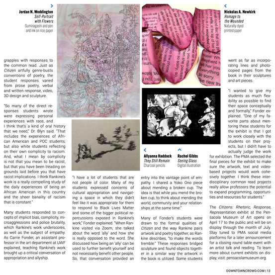 Art has the power to connect, inspire and spark critical discourse through historical and social movements. When more than 20 classes at the University of West Florida set out on a common read of poet Claudia Rankine’s book Citizen: An American Lyric, students began responding to the work in a wide variety of mediums. More than 700 students and community members tuned in to Rankine’s virtual lecture and visit in February hosted by the UWF Downtown Lecture series. Rankine’s book intertwines poetry, lyrical essay and visual art to create a collective portrayal of racial relations in the U.S. and day-to-day microaggressions experienced by African Americans. The “Citizens: Rhetoric, Response, Representation” exhibit at the Pensacola Museum of Art (PMA) opens on April 17 and will display an interdisciplinary display of student responses.