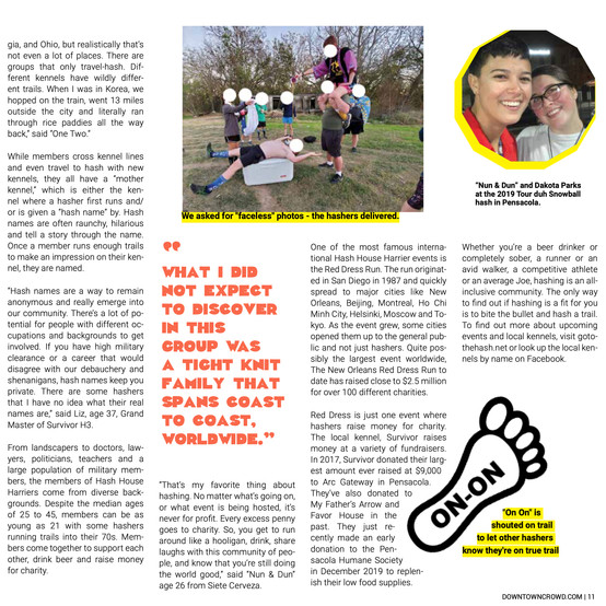 Downtown Crowd sent me out to get the scoop first-hand by going on trail with the local hashers. Despite running with a torn ligament in my knee, I was met with an outflux of support as members even stopped to help me hurdle a lowlying wire fence. What I did not expect to discover in this group was a tight knit family that spans coast to coast, worldwide. The local kennels in Pensacola are Survivor H3 and East Hill H3, while Siete Cerveza H3 and Emerald Coast H3 are based out of Fort Walton.