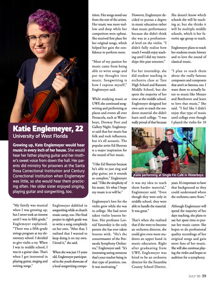 Kate Englemeyer is a lifelong musician and a violinist. She received her bachelor’s in music education from UWF and was just hired as orchestra director for the Escambia County School District.